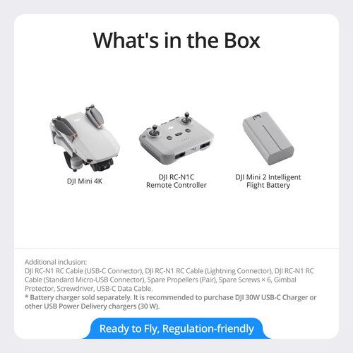 Take stunning UHD aerial videos at up to 4K30 resolution with the palm-sized Mini 4K Drone from DJI. The Mini 4K improves the video resolution of the Mini 2 SE while keeping the rest of its functionality, such as the 36 mph flight speed, up to 6.2-mile OcuSync 2.0 video transmission, and more. The Mini 4K also delivers on convenience, making it easy and fun for beginners and experts alike. QuickShots and panorama intelligent pre-programmed flight modes allow for pro results with just one tap. Even with its lightweight frame, the Mini 4K is safe to use with robust wind resistance and return-to-home functionality.